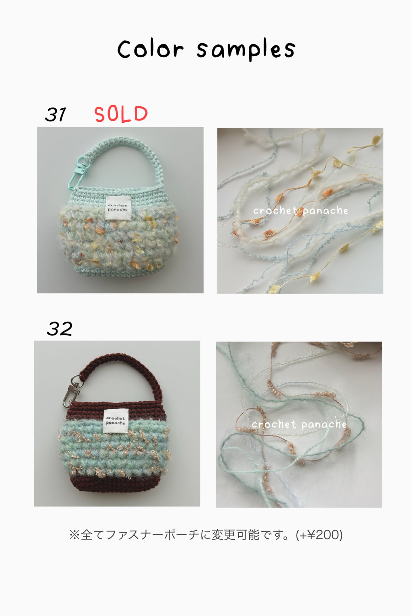 画像のサンプルからお選びいただき、番号とポーチの種類をお知らせください。
